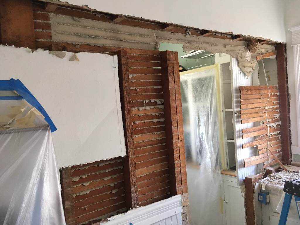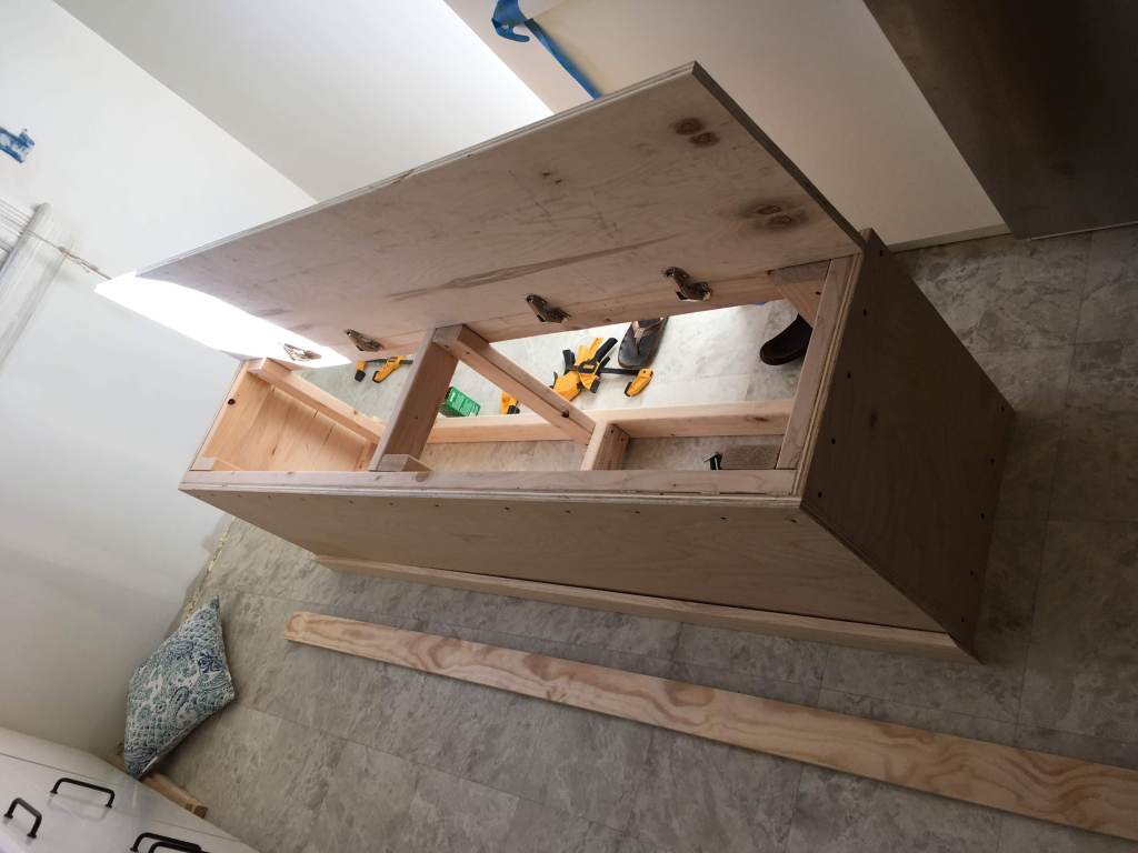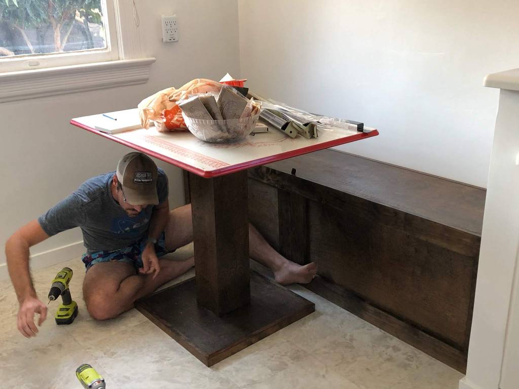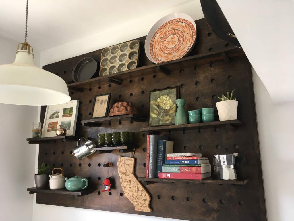 This, like sooo many other home improvement projects, took way longer than expected but it’s finally a livable space again. We started breaking down walls the day after my birthday (Dec. 5) and didn’t really have a working kitchen again until 4 months later. I’ll be the first to admit that it was worth it though. We basically demoed our old walk-in pantry, expanded the entry to act as a breakfast nook, and replaced all the cabinets and counters. In addition to the contract work that was done, I’ve included some photos of the personal projects I undertook to improve the new space; breakfast nook table & bench, shelves, and giant pegboard.