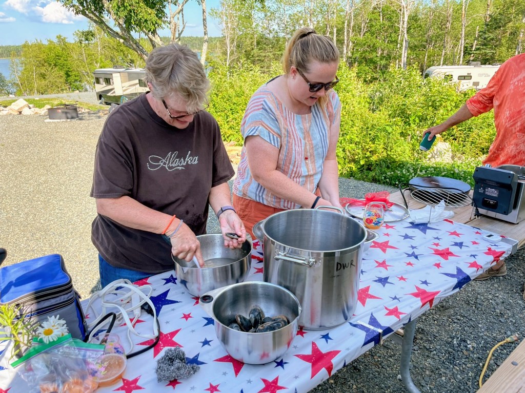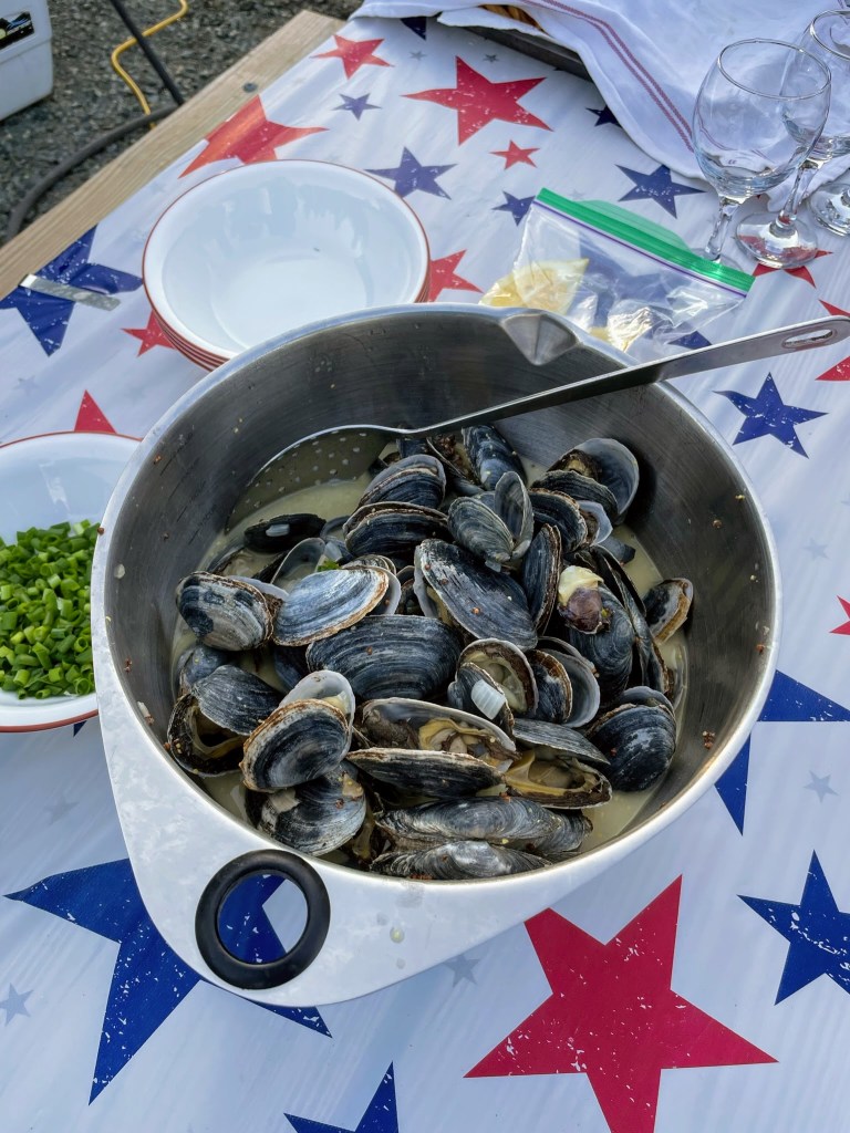 The rest of the day was spent securing ingredients for our dinner from Chipman’s Wharf. They offered an impressive array of seafoods including 5 varieties of oysters. Laura and I suggested cooking clams in the style of “moules frites” which is to say, steamed in wine and served with french fries. It was a great success and we of course accompanied them with several oysters.