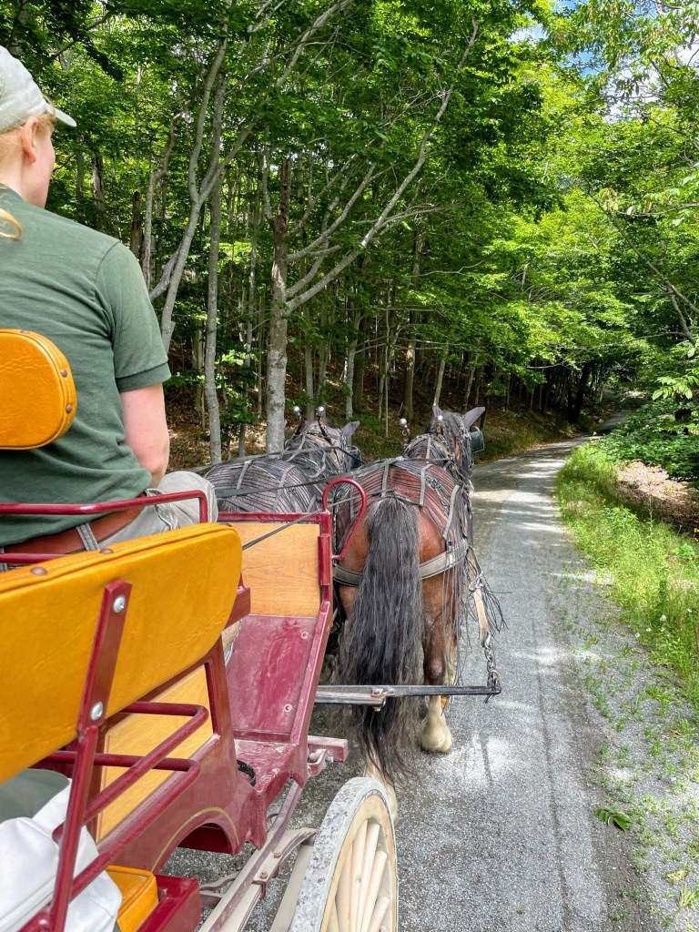At mid-day I met up with Mom and David for a quick horse drawn carriage tour around Day Mountain. The carriage roads are a unique part of Acadia. They were primarily built by Rockefeller so he could ride his horses away from car traffic and now they serve for hikers/bikers to enjoy the park away from car traffic. I thoroughly enjoyed exploring them. The day ended with beers at Bar Harbor and a nice multicourse meal at the Chart House.