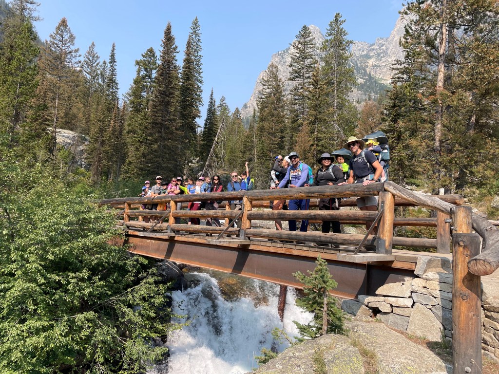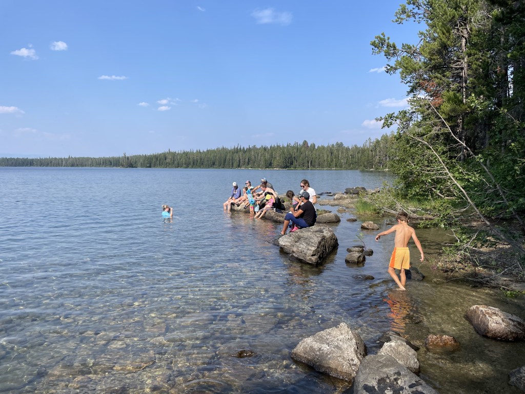 Grand Teton National Park was where we spent our first full day. We got the whole group up and moving early to beat the crowds to Jenny Lake. We were moderately successful. While parking was not ideal, the line for the boat shuttle to get across the lake wasn’t too bad. Once across the lake, we hiked a small loop trail to a massive waterfall. After lunch, we returned in the afternoon to go swimming at Leigh Lake.